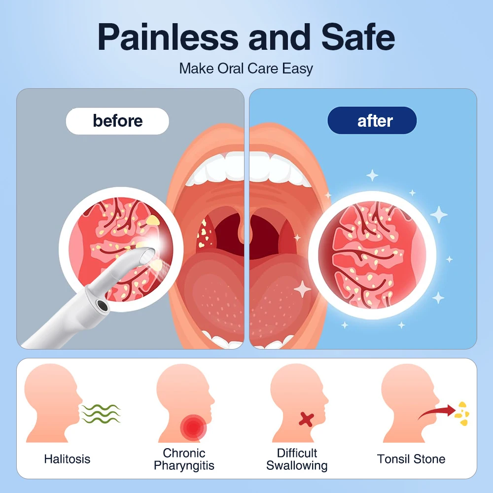 4. Our rechargeable tonsil stone remover includes 4 food-grade silicone tips: an angled tip for surface stones, a 45° tip for deep crypts, a flat tip for routine cleaning, and a loop tip for embedded stones. Four types of suction tips remove stones painlessly and are suitable for use in the throat. They do not cause gagging.